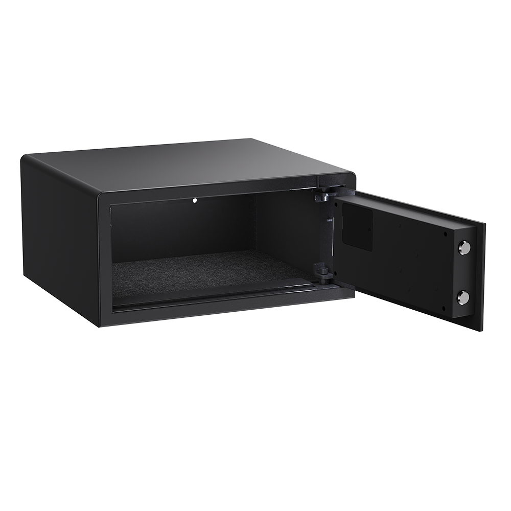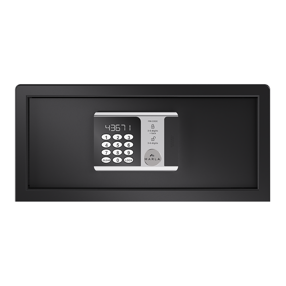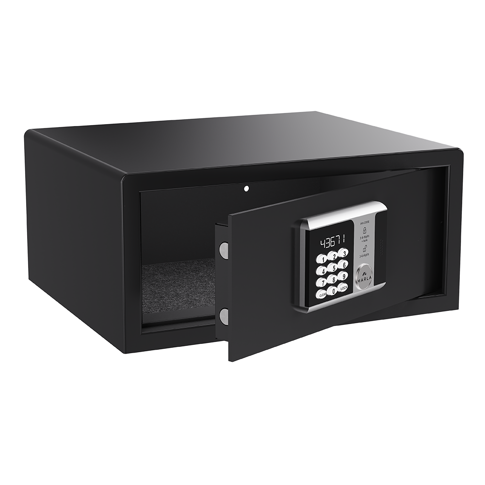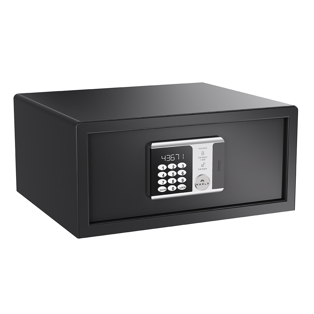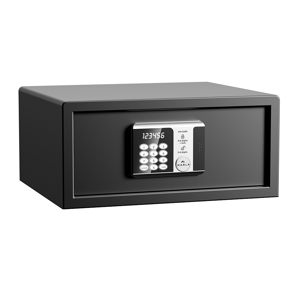 The Marla EliteLine is a high-security laptop-sized safebox specially designed for hotel rooms, offices, residences, and commercial spaces. It features an interior spacious enough to store laptops up to 15 inches and other valuables. With its modern design, advanced security features, and user-friendly interface, it provides guests with a safe and stylish experience.